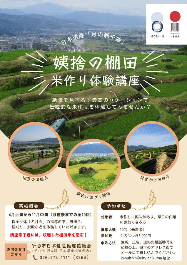 日本遺産「月の都千曲」の構成文化財でもある姨捨の棚田で、米作り体験講座を開催します。