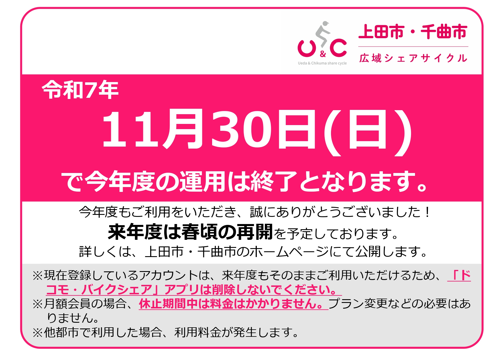令和7年度 シェアサイクル運用終了のお知らせ
